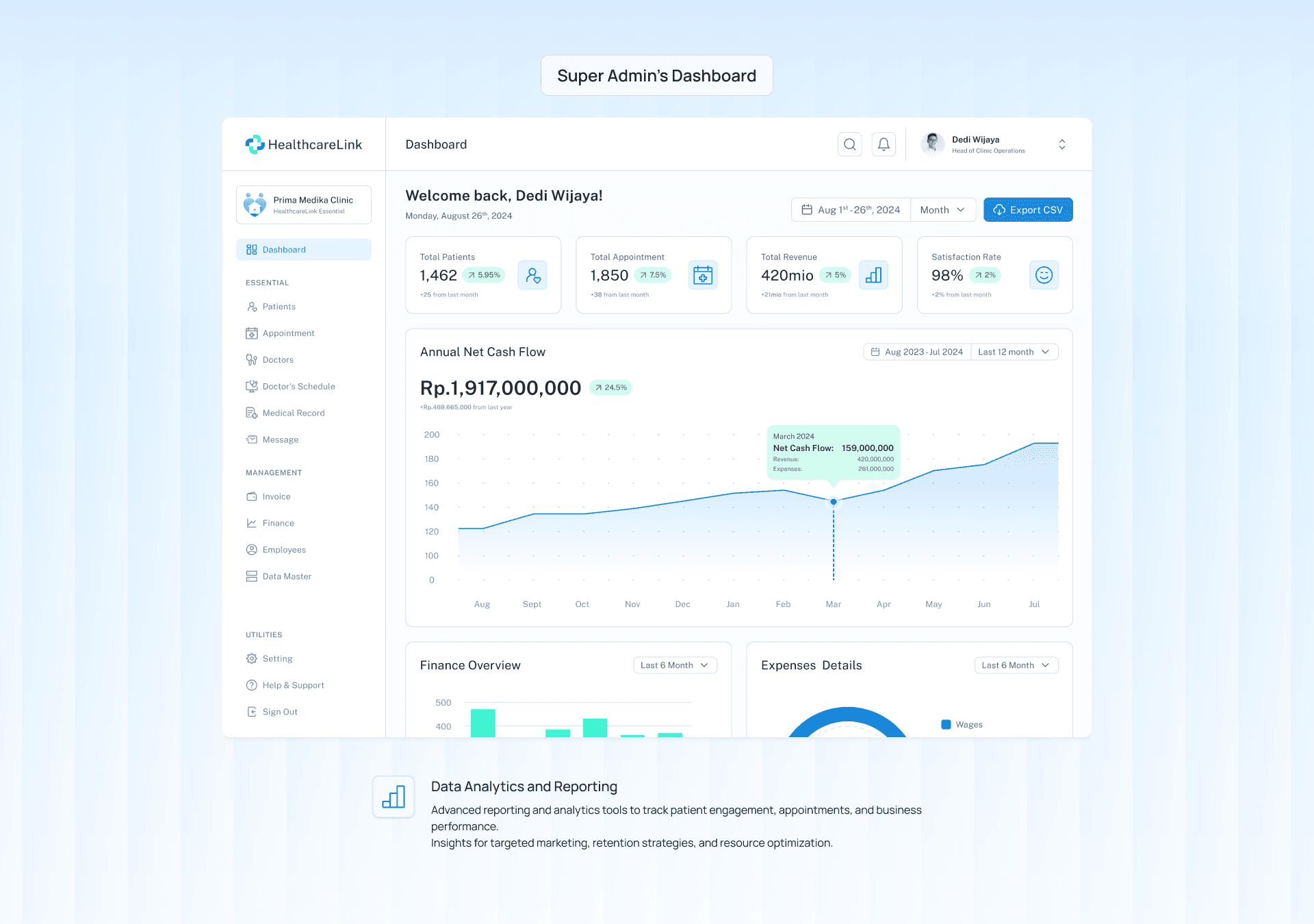 Advanced reporting and analytics tools to track patient engagement, appointments, and business performance.