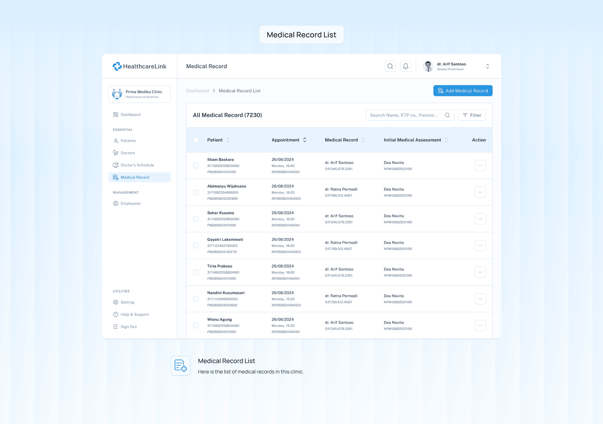 A patient named Ilham feels unwell and heads to Prima Medika Clinic. Upon arriving, he makes an appointment. While waiting in the waiting room, a nurse checks his vital signs. Ilham then meets with the doctor and, after the consultation, proceeds to pay and collect his medication.