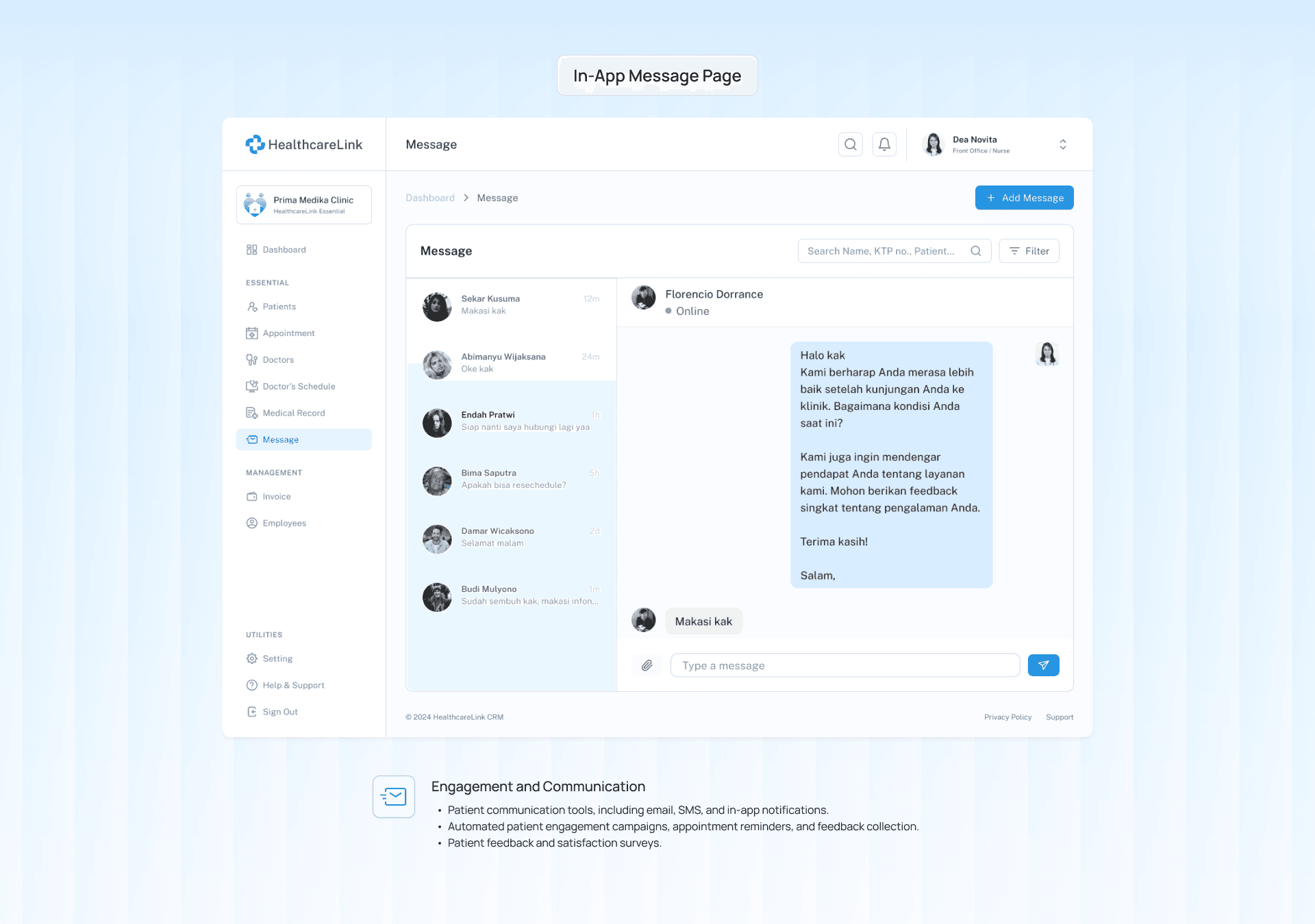 Automated patient engagement campaigns, appointment reminders, and feedback collection.