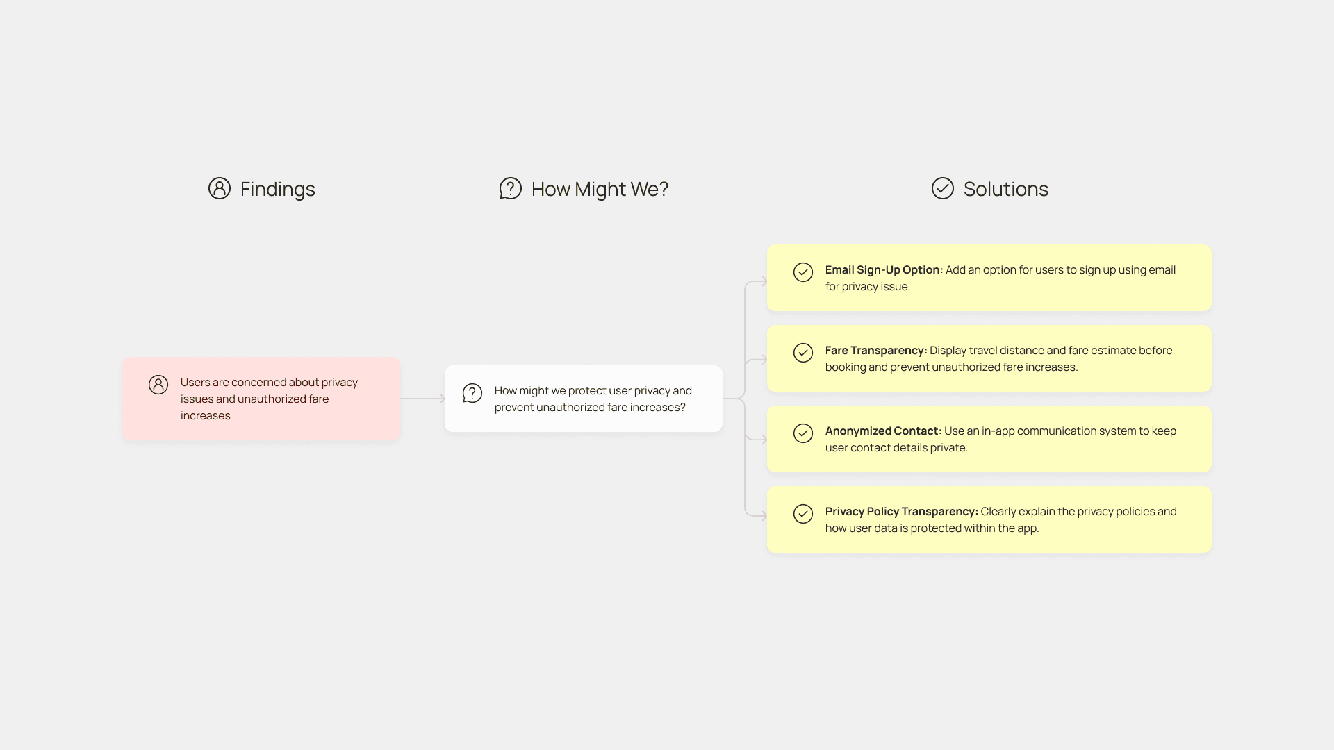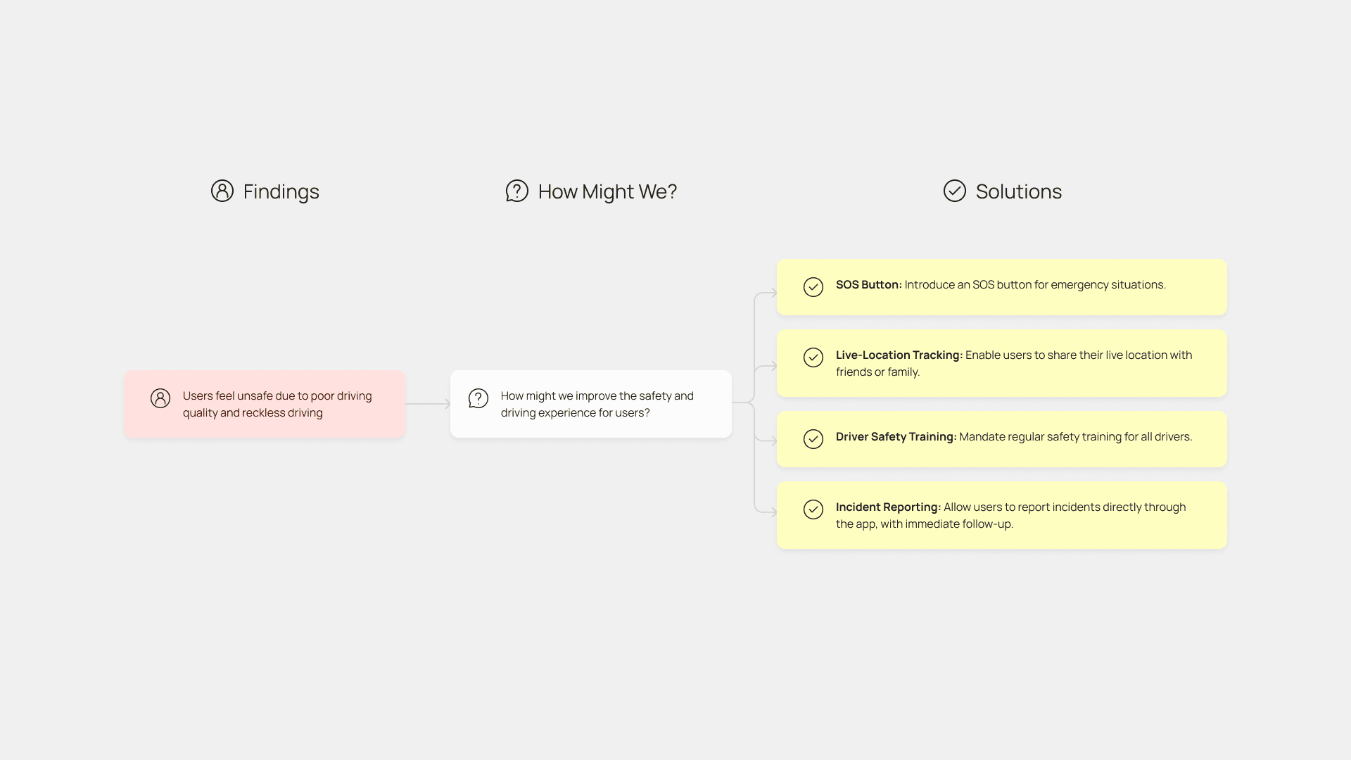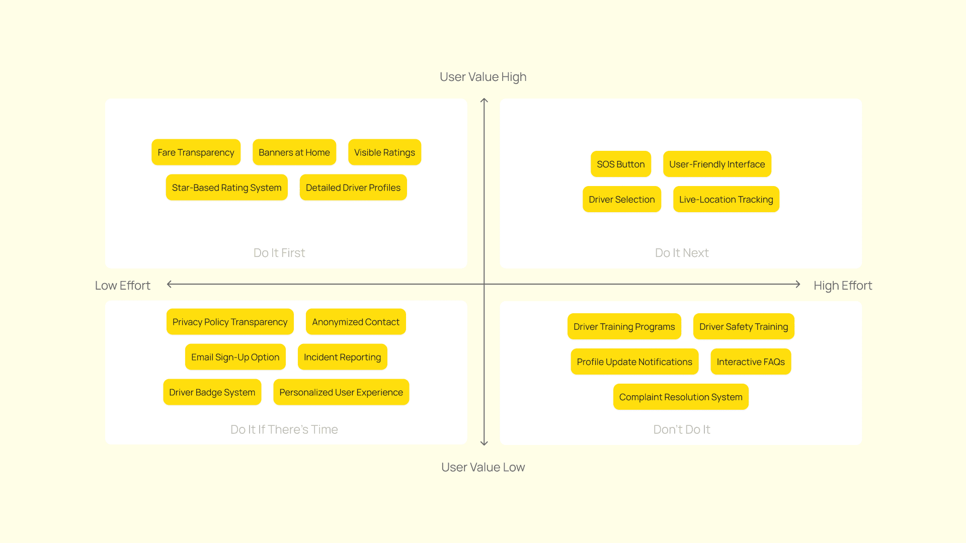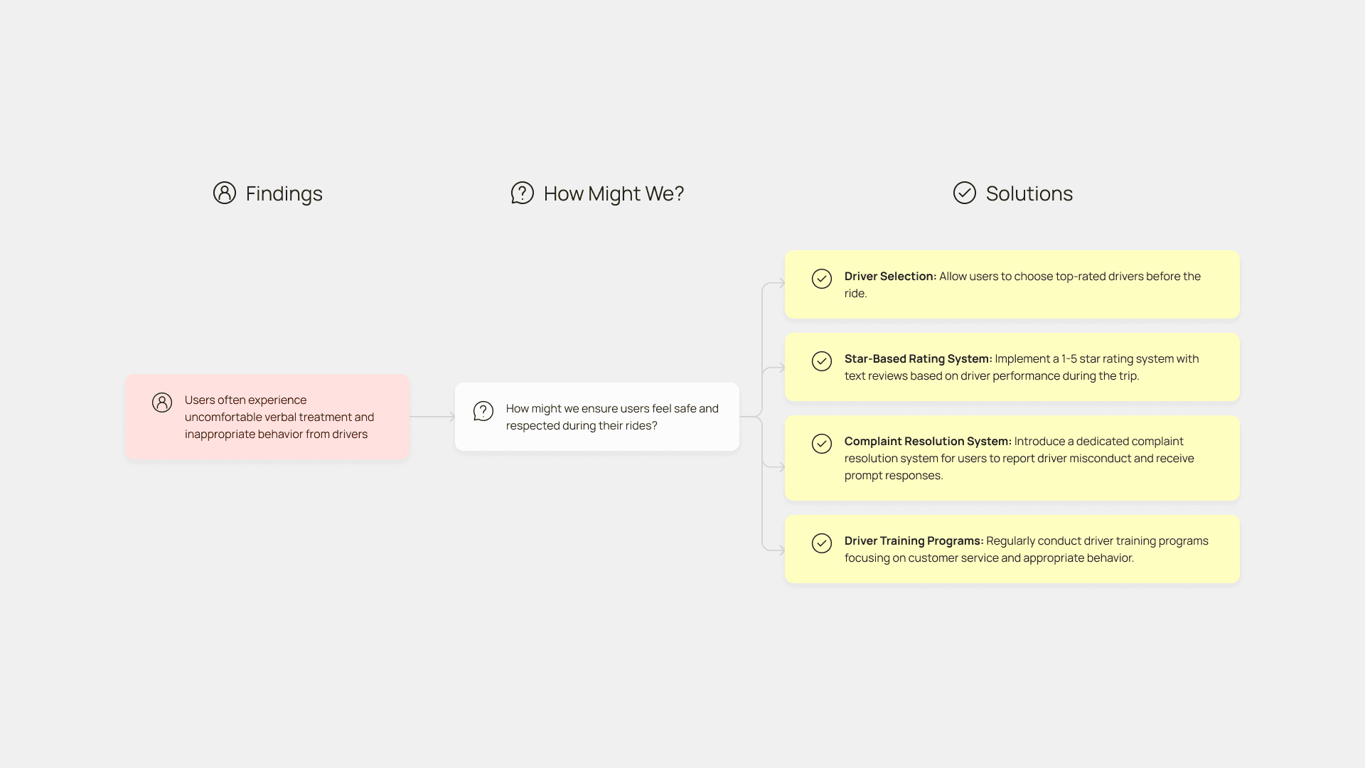 With the research insights in hand, I developed key solutions to address the identified pain points. The most impactful solution was a new driver selection feature, allowing users to view driver ratings and choose their driver before booking a ride.