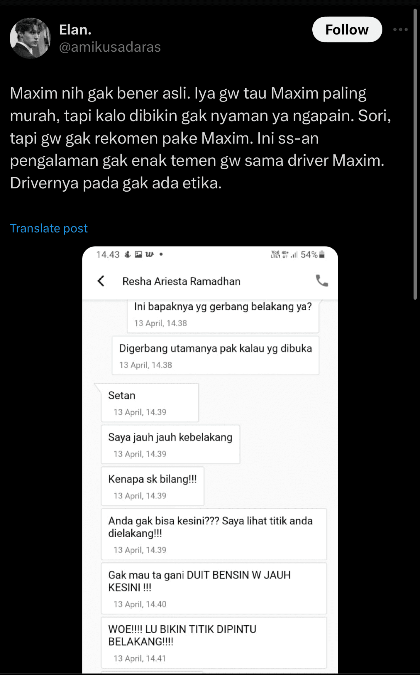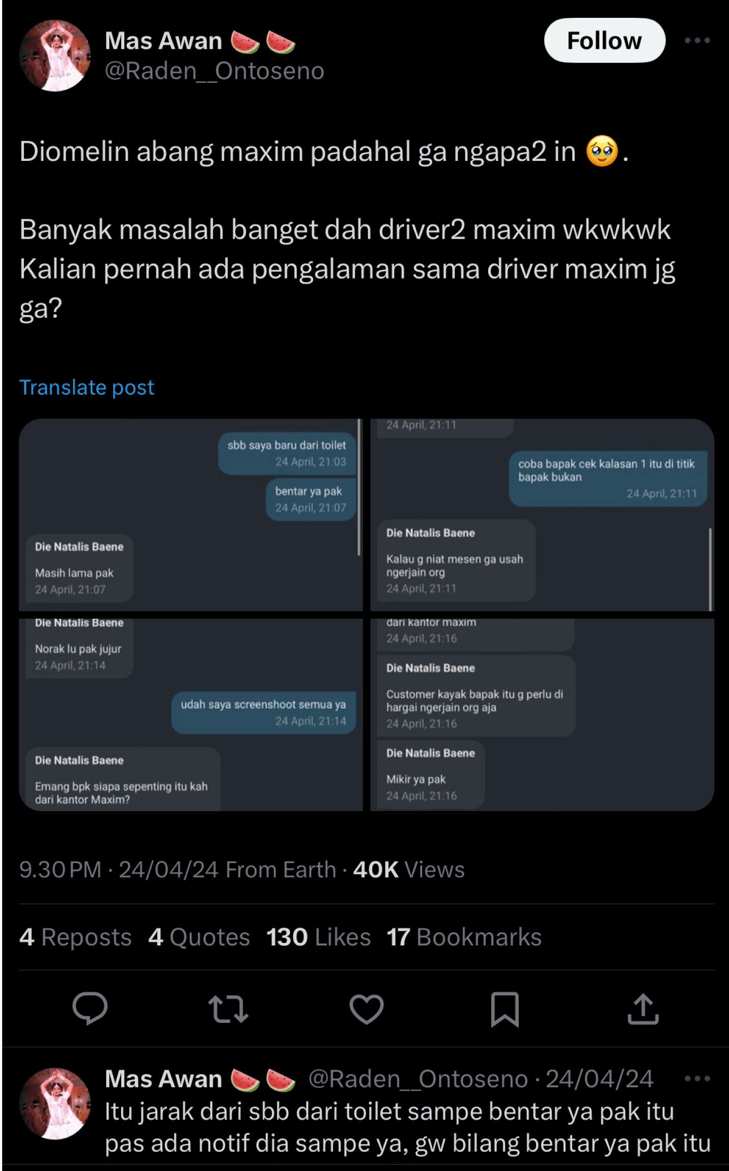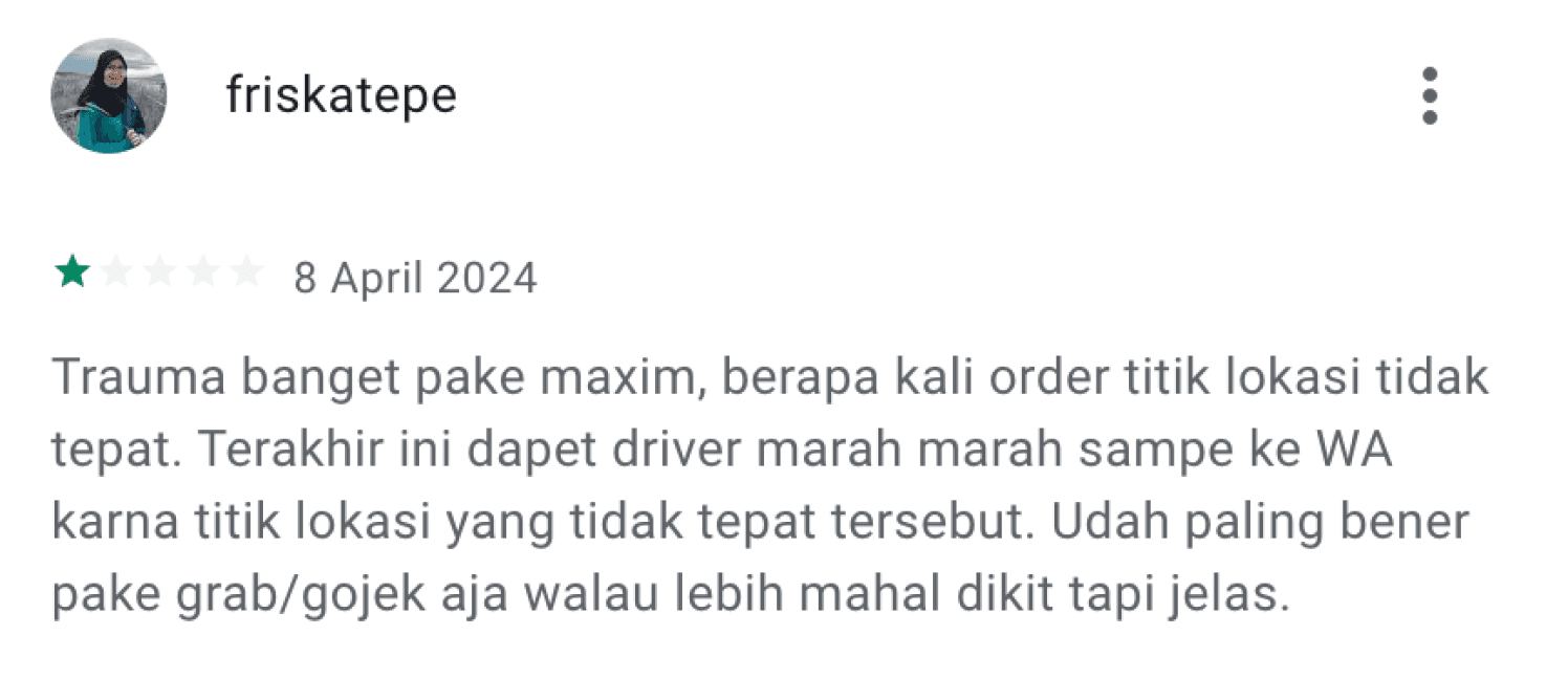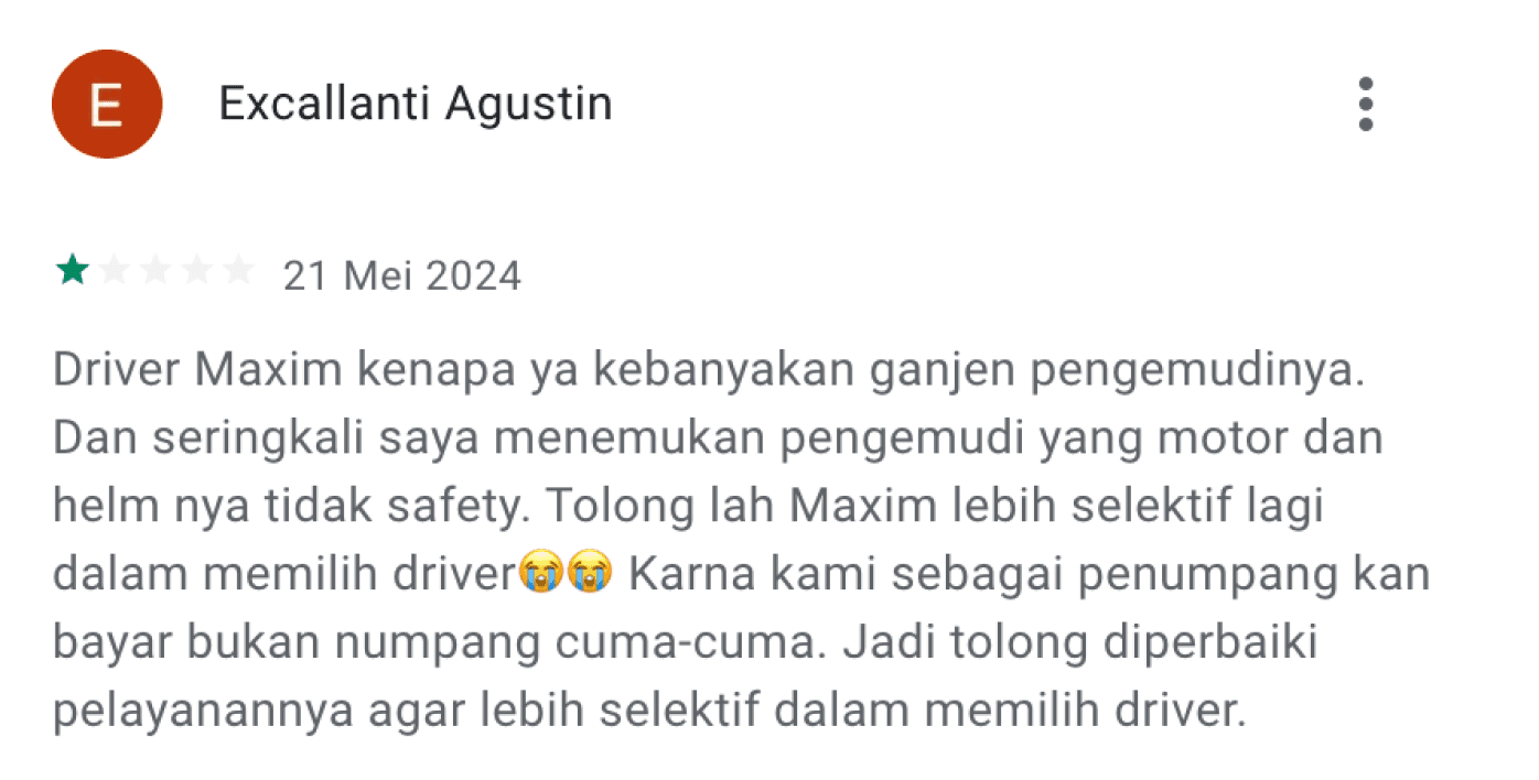 Even though Maxim is relatively new, it's already quite good, but there's still a lot to improve in terms of Safety and Trust. Actually, in every online transportation app, there are always problematic drivers. However, people in Indonesia naturally lean towards Gojek or Grab because these platforms have been around longer than Maxim and have built a stronger reputation.