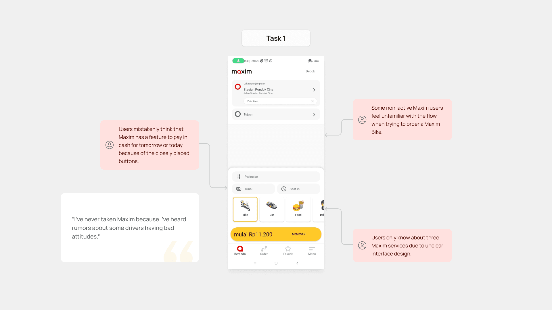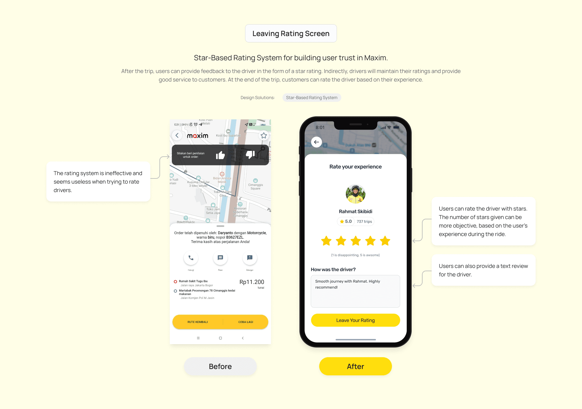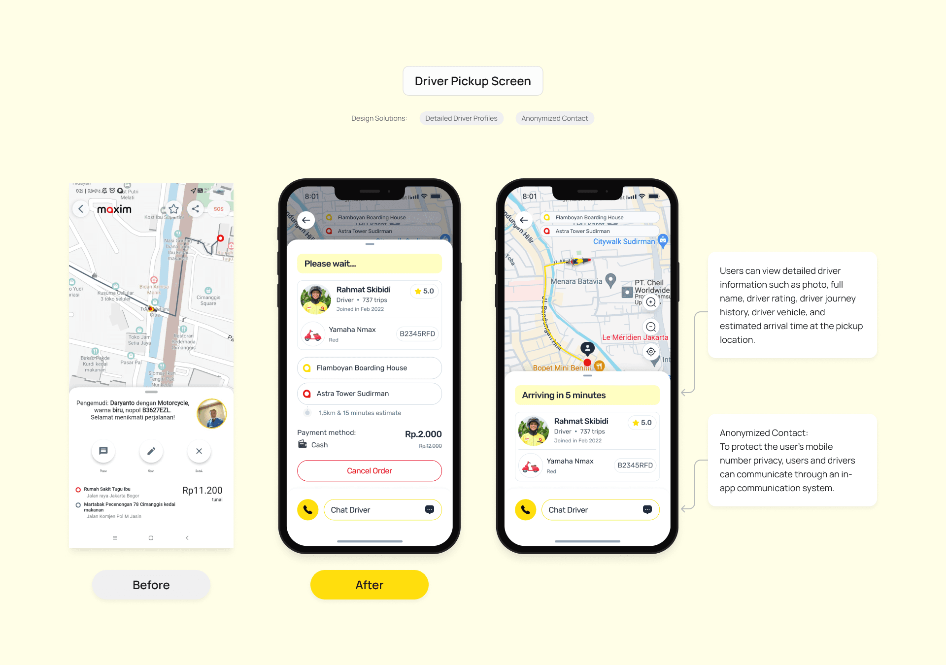 This project was about more than just redesigning an app—it was about restoring trust. By listening to user concerns and addressing them head-on, this improvement could hopefully put Maxim in a stronger position to compete in the Indonesian market. The combination of affordability and safety makes Maxim a compelling option for riders who value both cost and peace of mind.