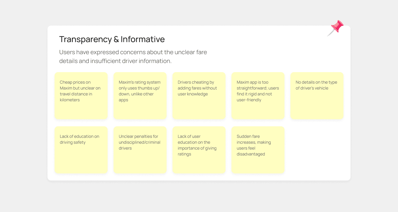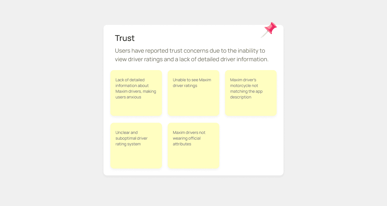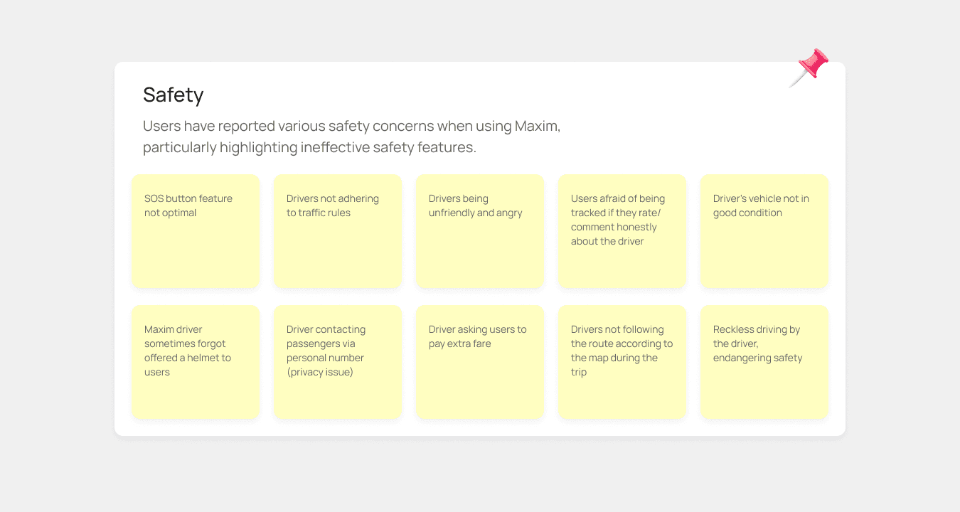 From these stories, it's clear that Maxim needs to step up their game and add safety features to build trust and make passengers feel safe and comfortable during their rides. This aligns with Maxim's mission “To help people travel to their destinations in a modern, easy, and safe way.”