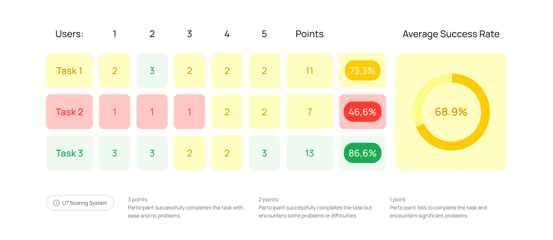 A success rate is a metric that measures how well users perform specific tasks. The average score for a product with good usability is around 80%. However, the result was only 68%, and there were several insights and feedback from users as follows: