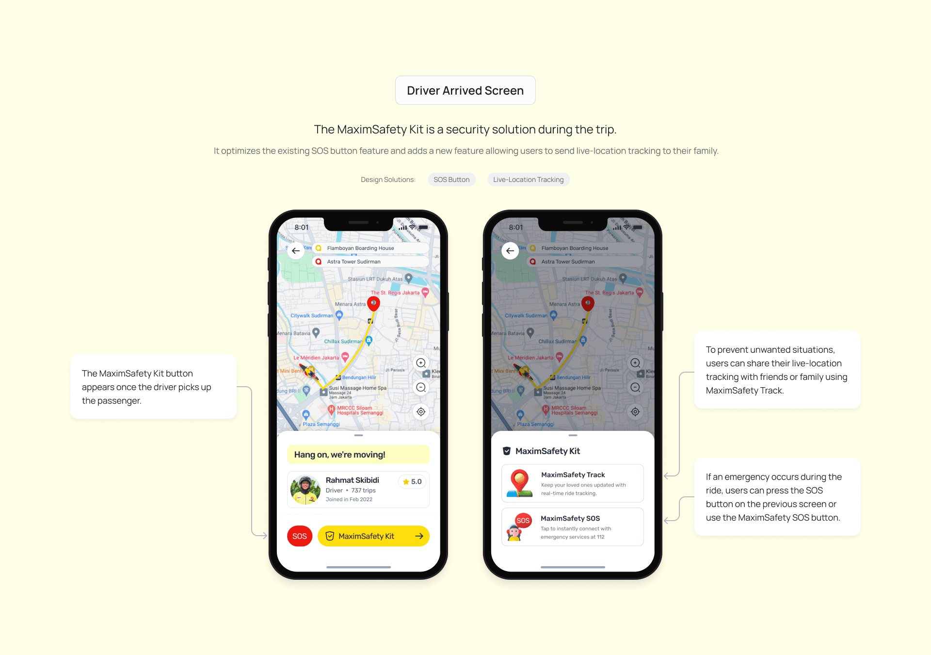 Additionally, I introduced the MaximSafety Kit, a security solution designed for users during their trip. This kit optimizes the existing SOS button feature and adds a new capability for users to send live-location tracking to their family.