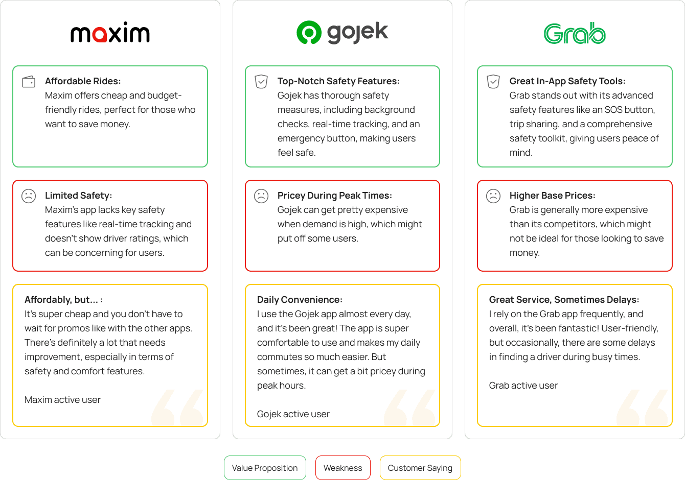 Understanding the value proposition, customer saying, and weaknesses of Maxim, Gojek, and Grab to identify opportunities for improvement and differentiation.