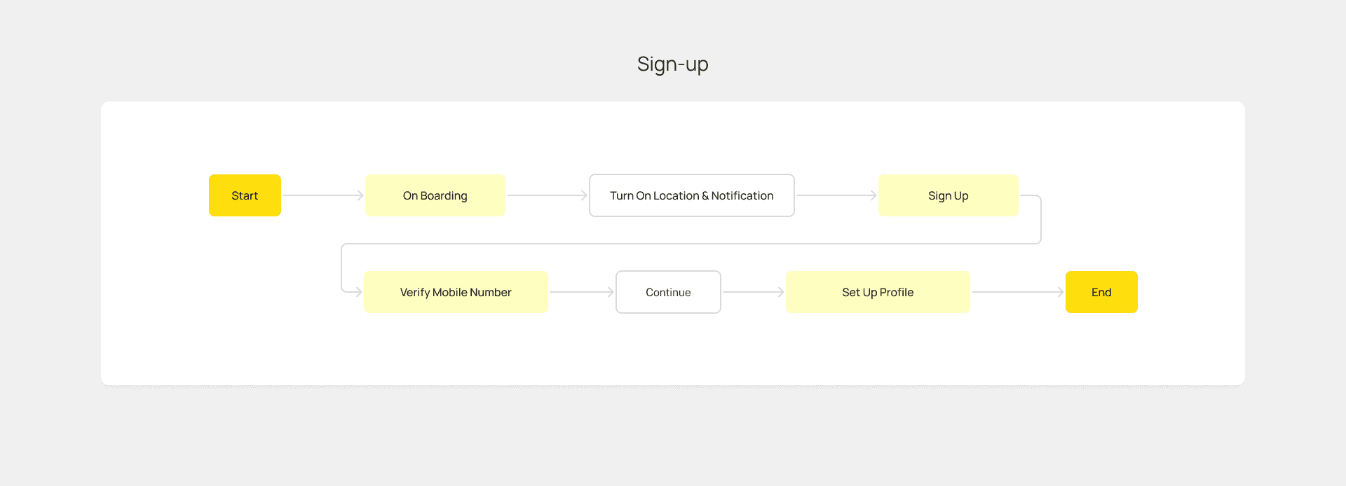 Here are the design solutions based on the order of screens from the user flow, starting from sign-up to order summary:
